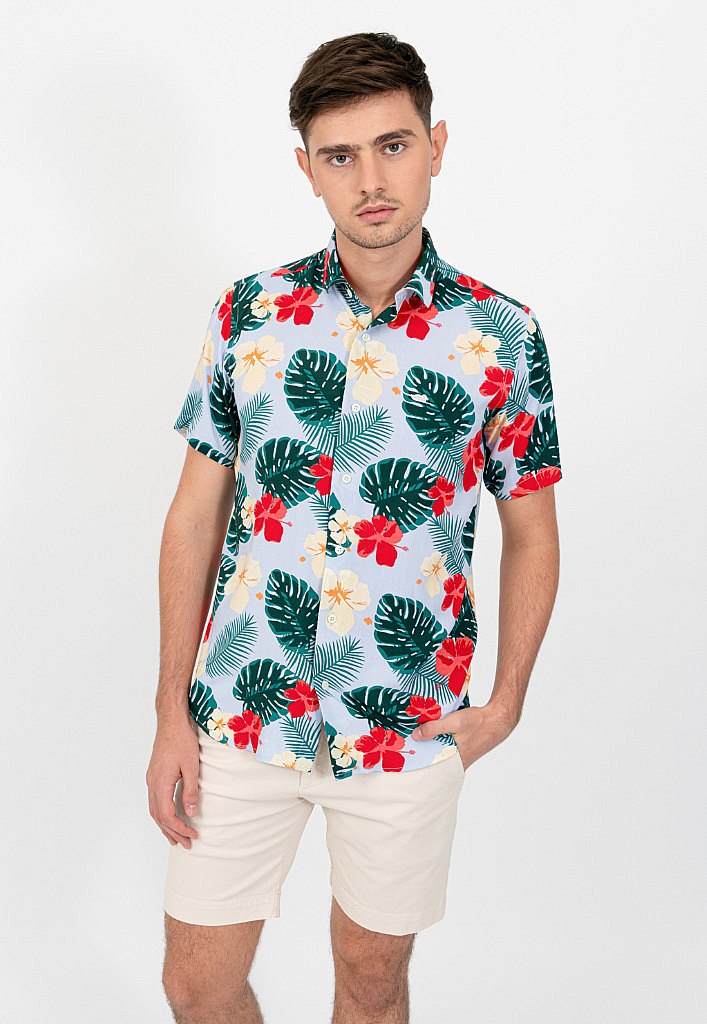 Camisa Corte Clasico Fibrana Celeste Flor HojasDescripción