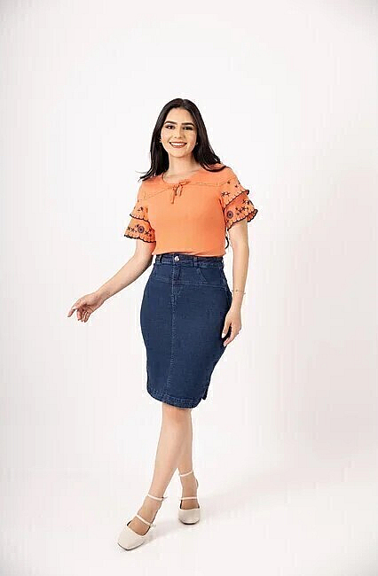 Saia Jeans Feminina Azul Sidriane Com Fendas Laterais E Bolsos Nitido - Ref:238.0178Tamanhos disponíveis