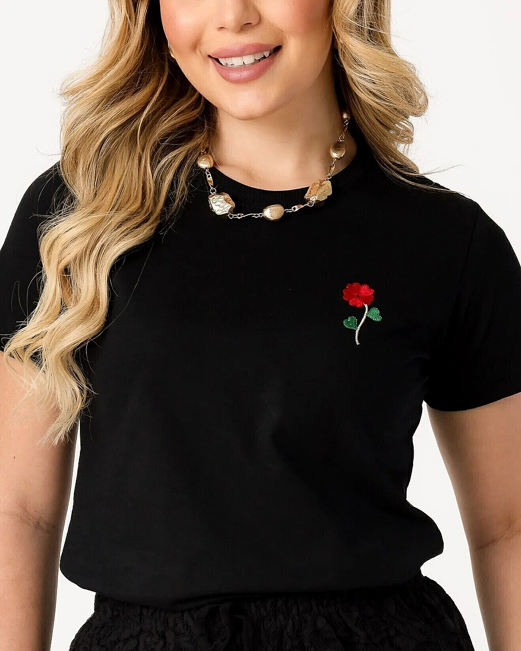T-Shirt Feminina Preta Com Flor Bordada – 100% Algodão Premium Ref.16445020Descrição
