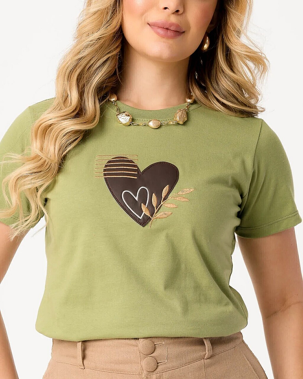 T-Shirt Feminina Verde Oliva Com Bordado De Corações, Folhas E Linhas – Conforto, Qualidade E Estilo Ref.16720020Descrição