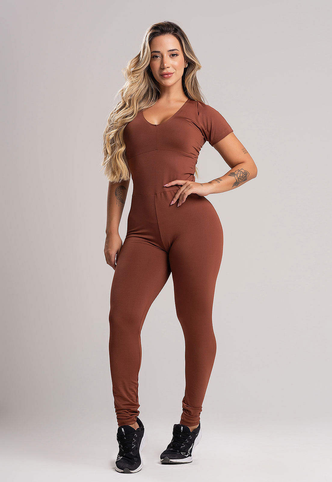 Macacão Longo Manga Curta Costa Fechada MarromDescrição