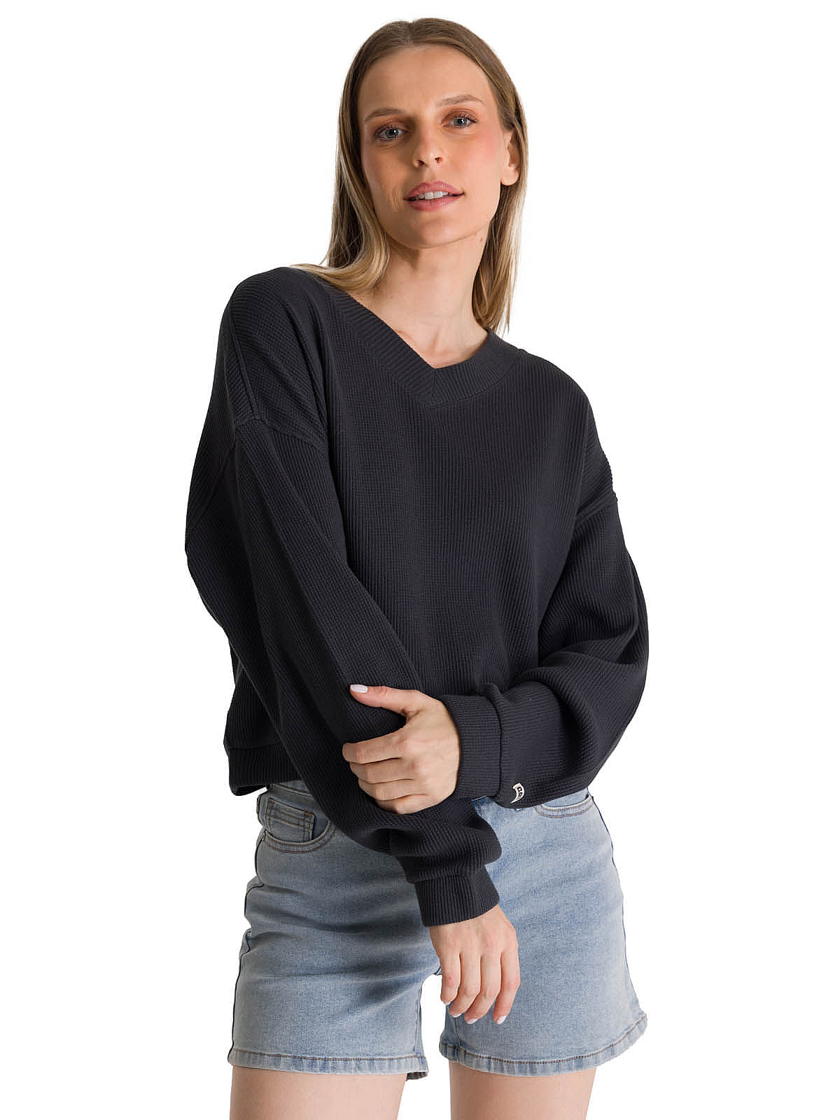 Polerón Cuello En V Mujer Oversize Waffle Grafito Cat