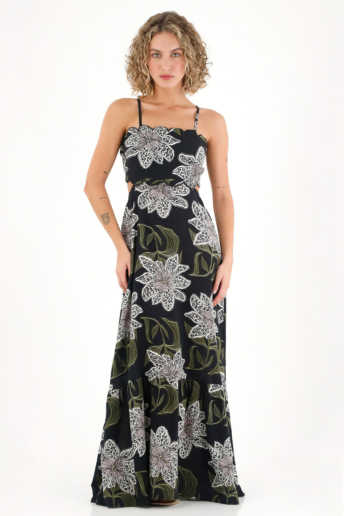 Vestido Largo Con Estampado Y Cut Out En Cintura Negro Para MujerTalles disponibles