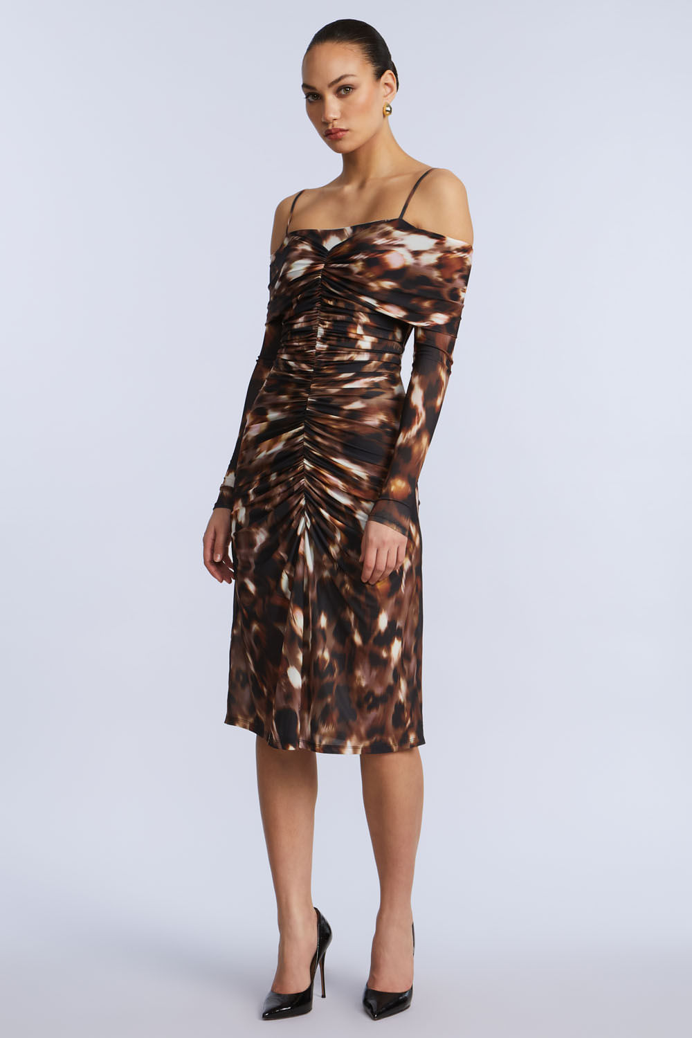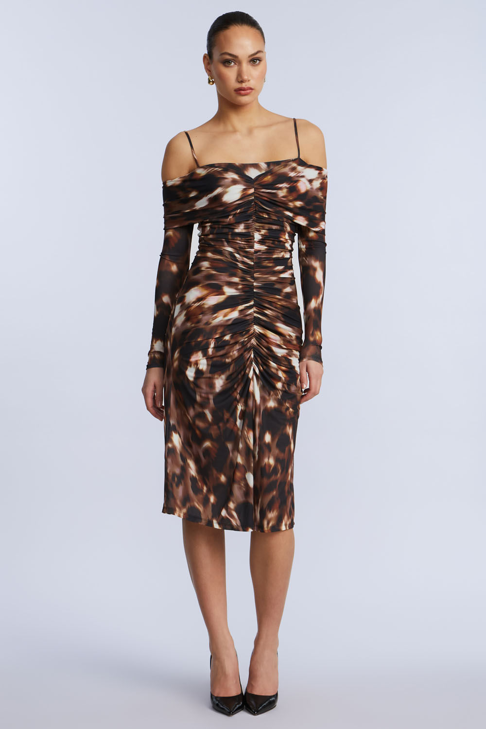 Vestido Midi Hombros Descubiertos Frunce Animal Print Leopardo Abstracto