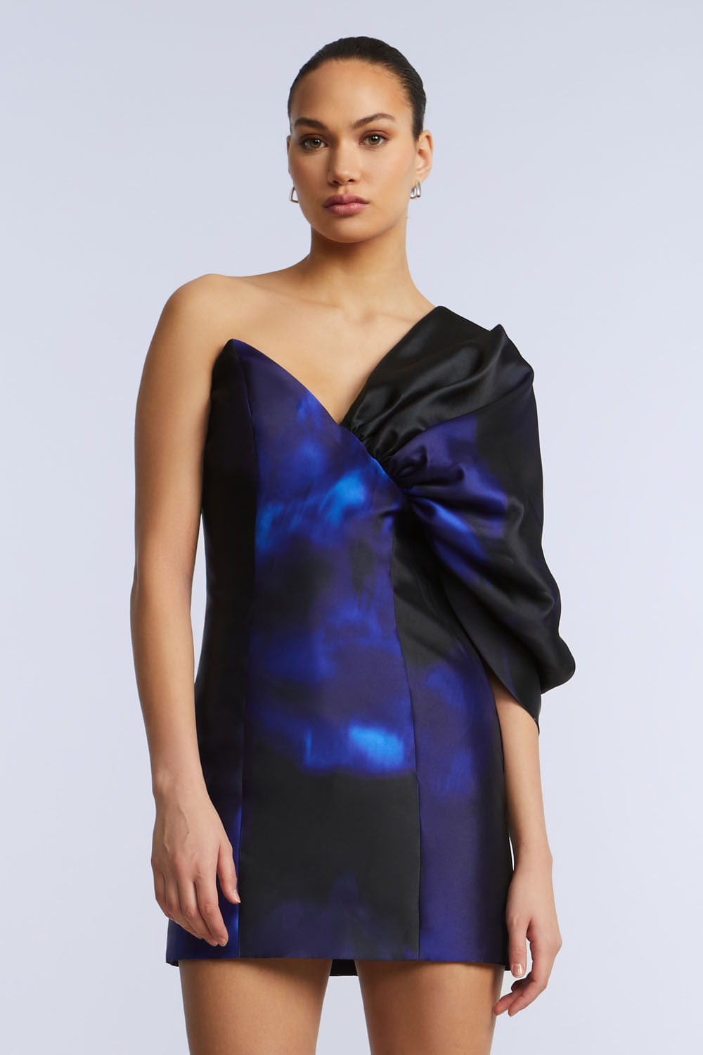 Vestido Corto Asimétrico Manga Abullonada Estampado Floral Abstracto