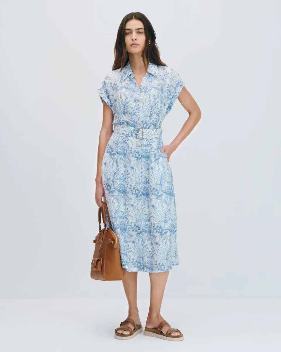 Vestido Camisero Midi De Lino Estampado Floral Azul Con Cinturón