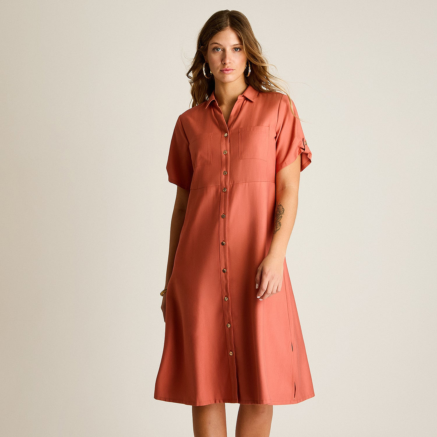 Vestido Midi Terracota Sin Forro Calce HolgadoDescripción