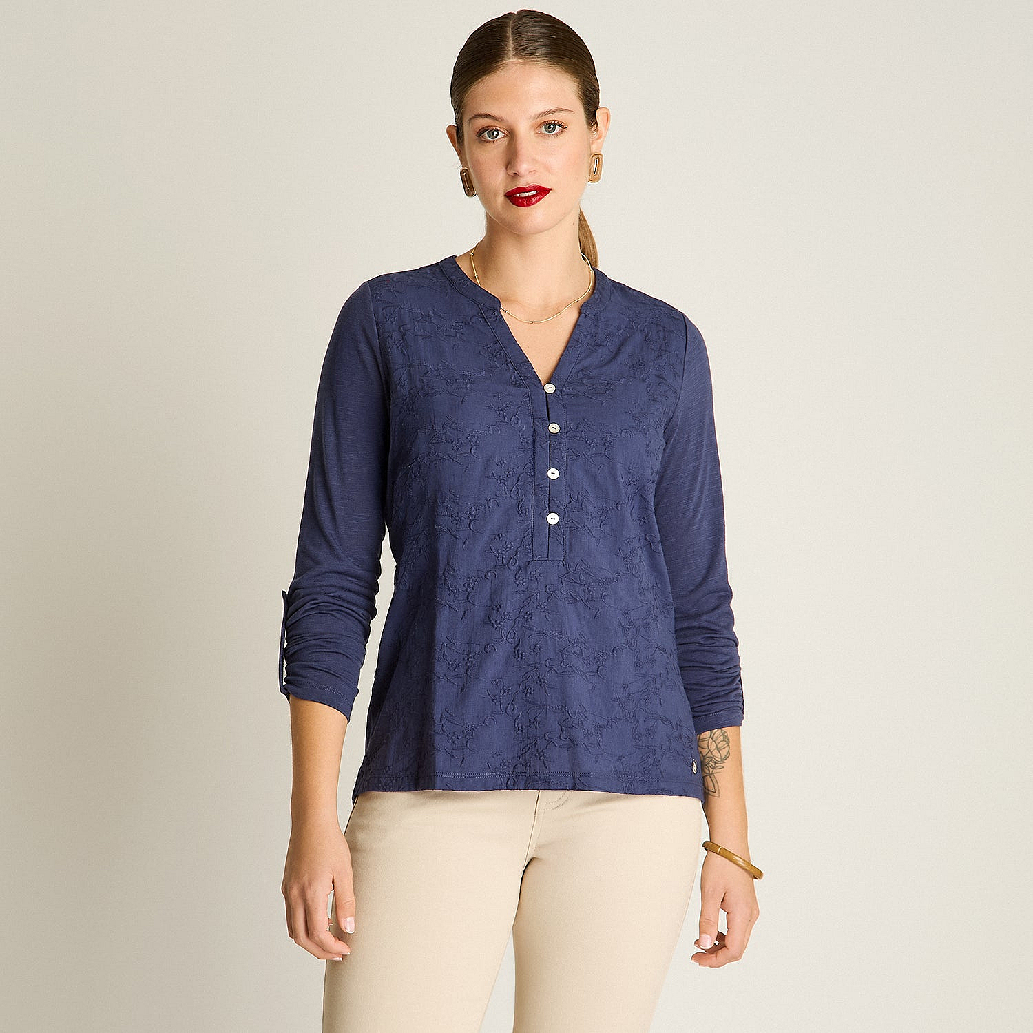 Polera Azul Manga Larga Con Cuello Mao Y Detalles BordadosColores disponibles
