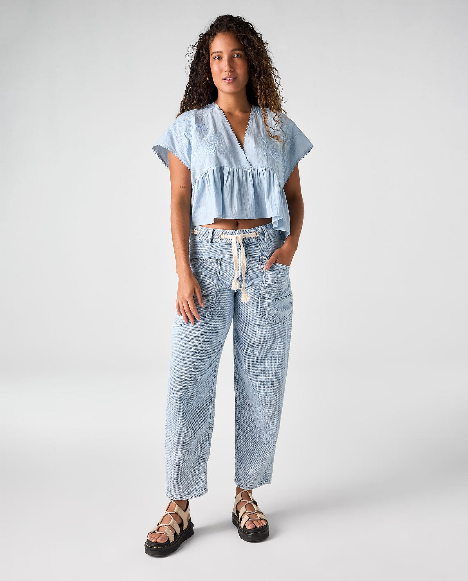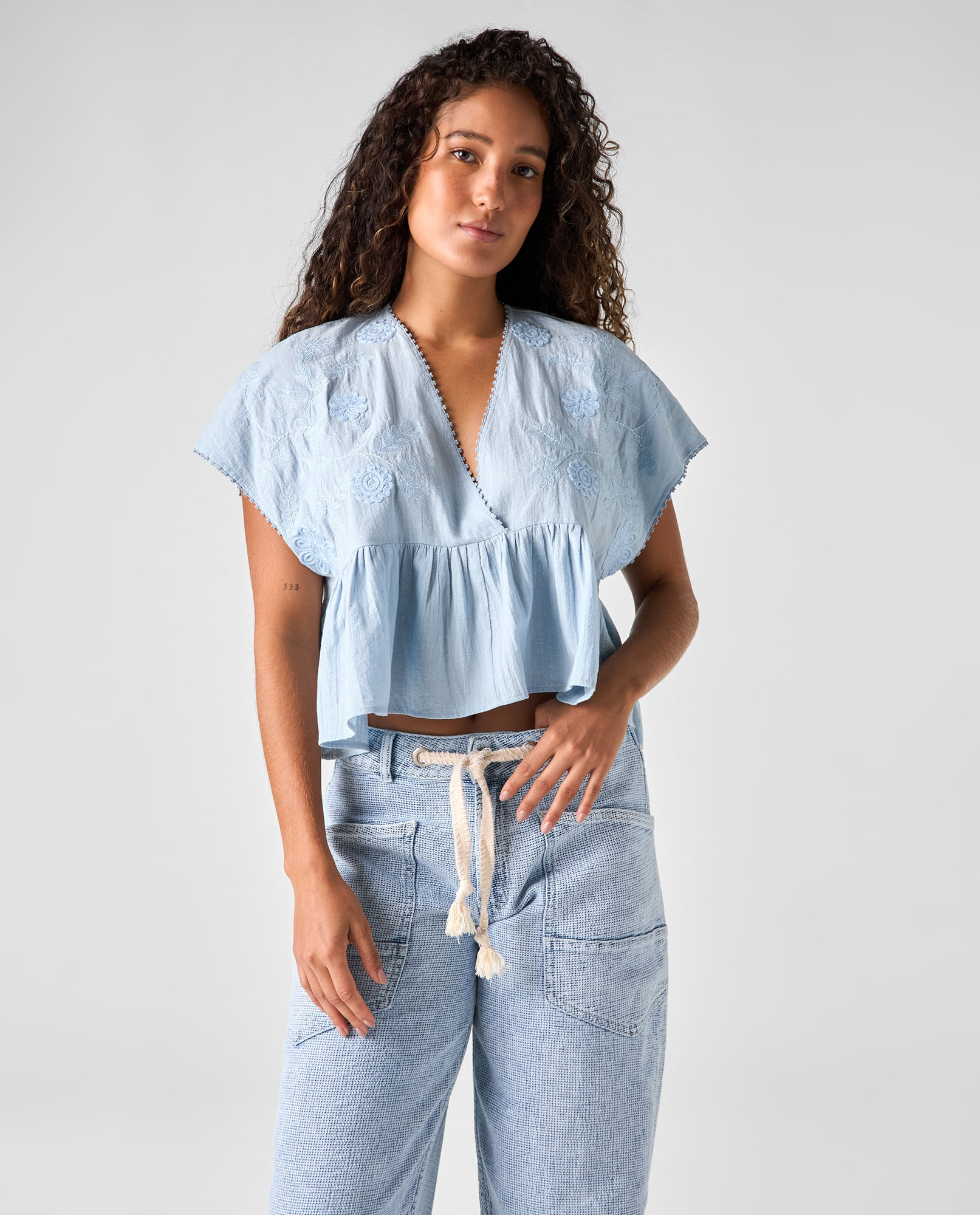 Camisa Cuello En V Con Detalles Bordados Para MujerTalles disponibles