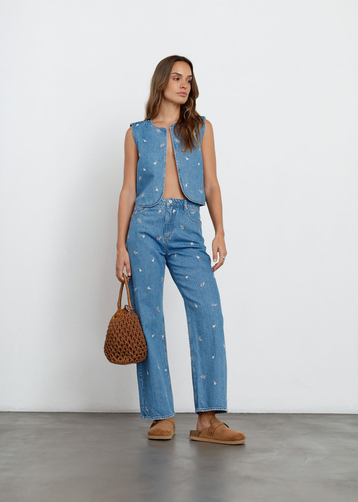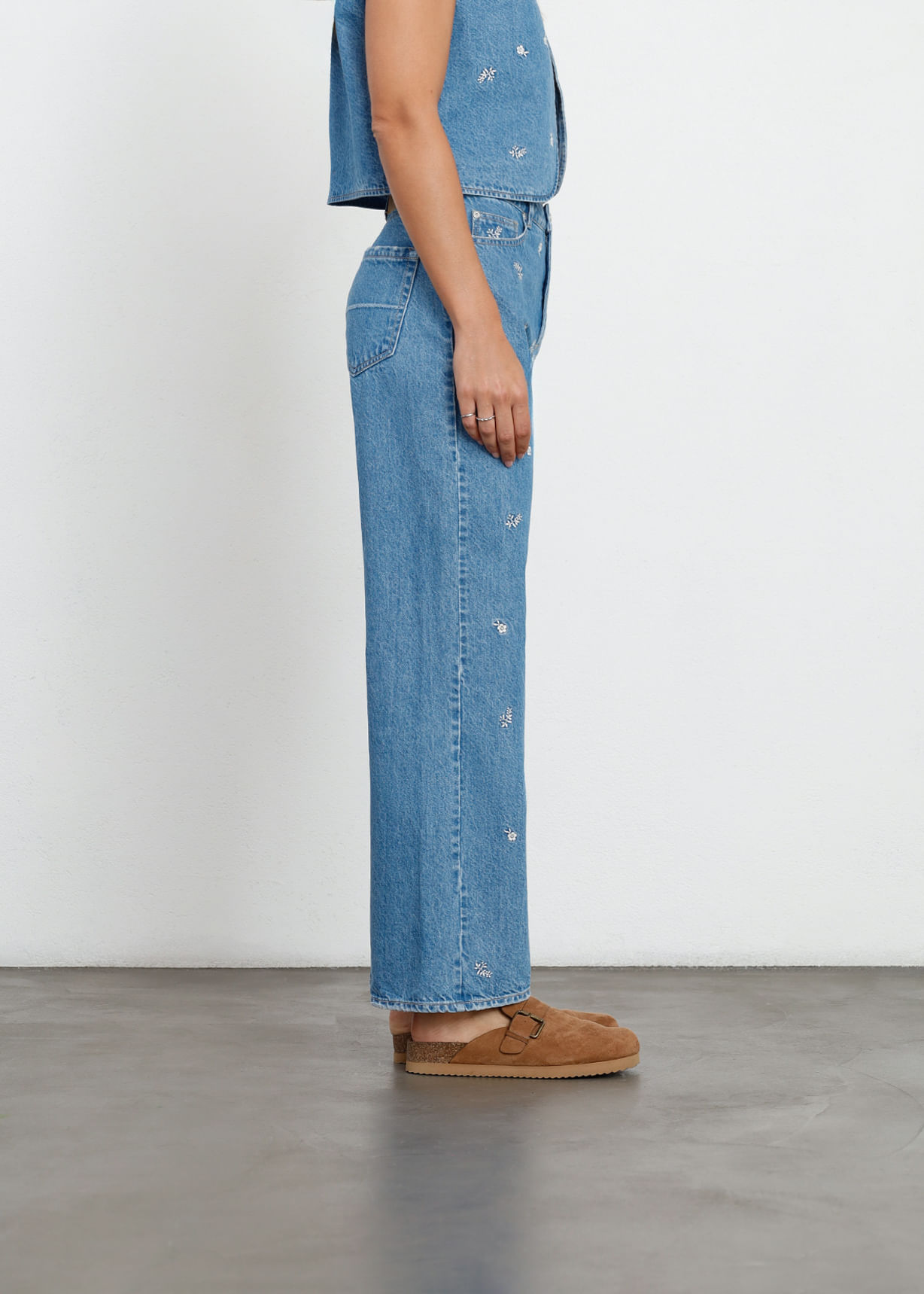 Jean Straight Tiro Alto Con Bordados De Flores