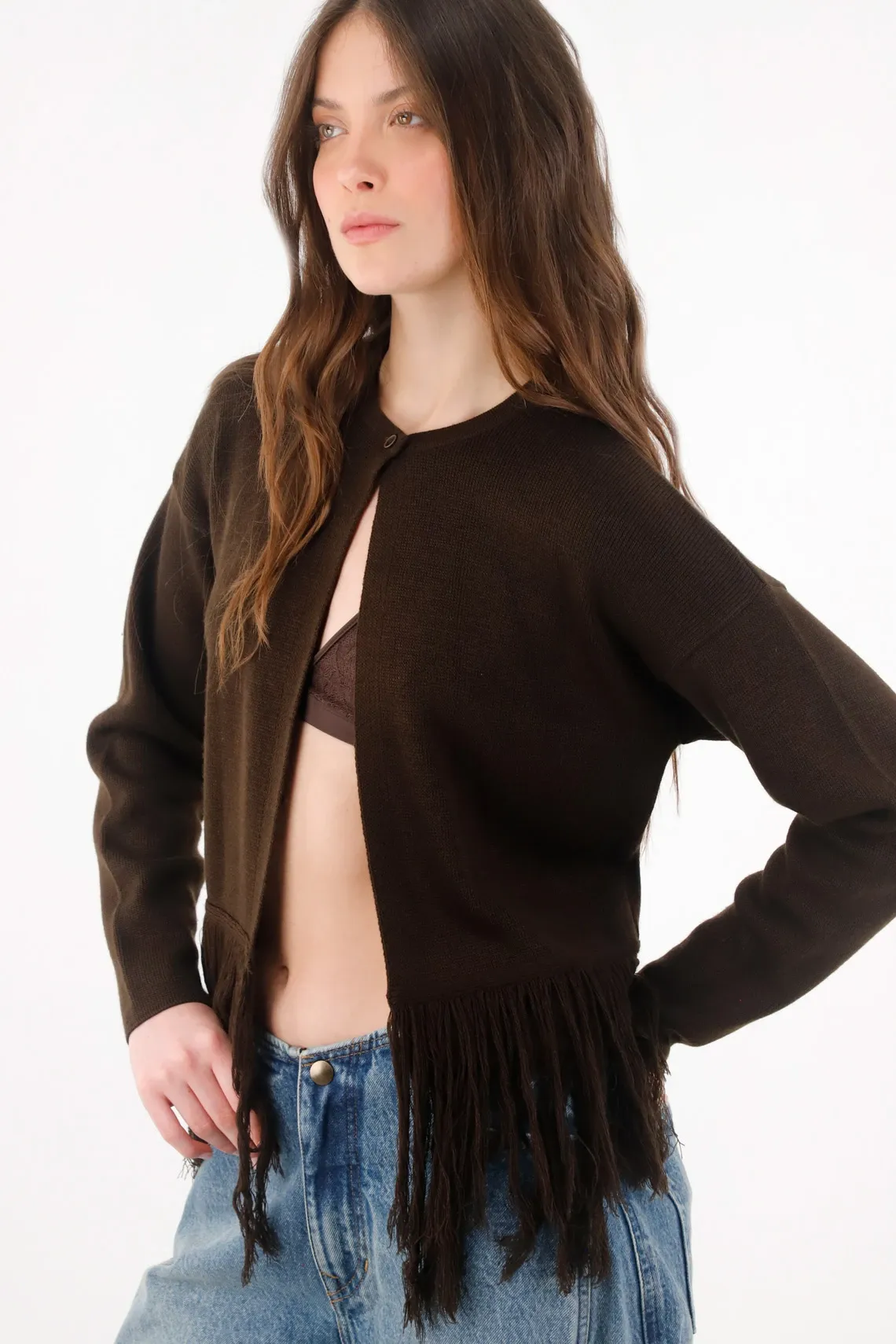Cárdigan Para Mujer De Punto Café Oscuro Fit Relajado Con Flecos En El Bajo