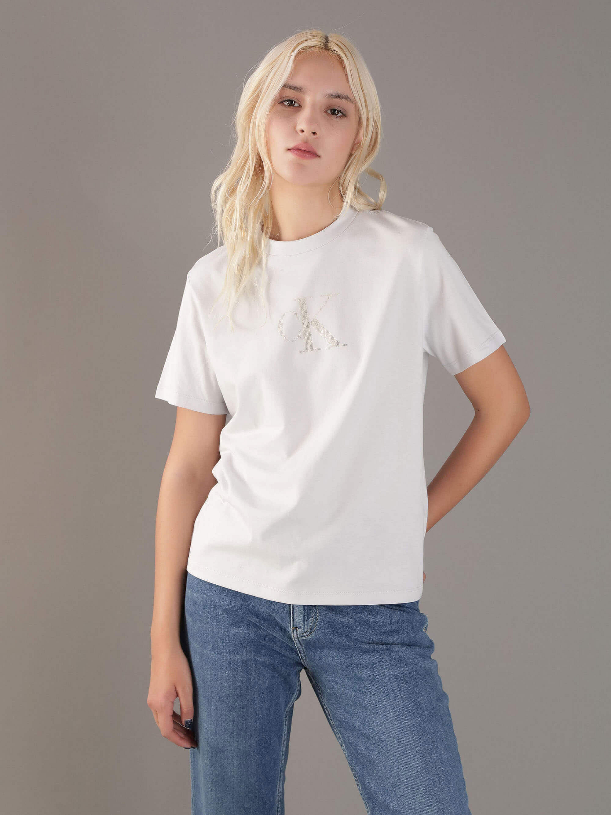 Playera Calvin Klein Monograma Estampado Metalizado Mujer GrisTalles disponibles